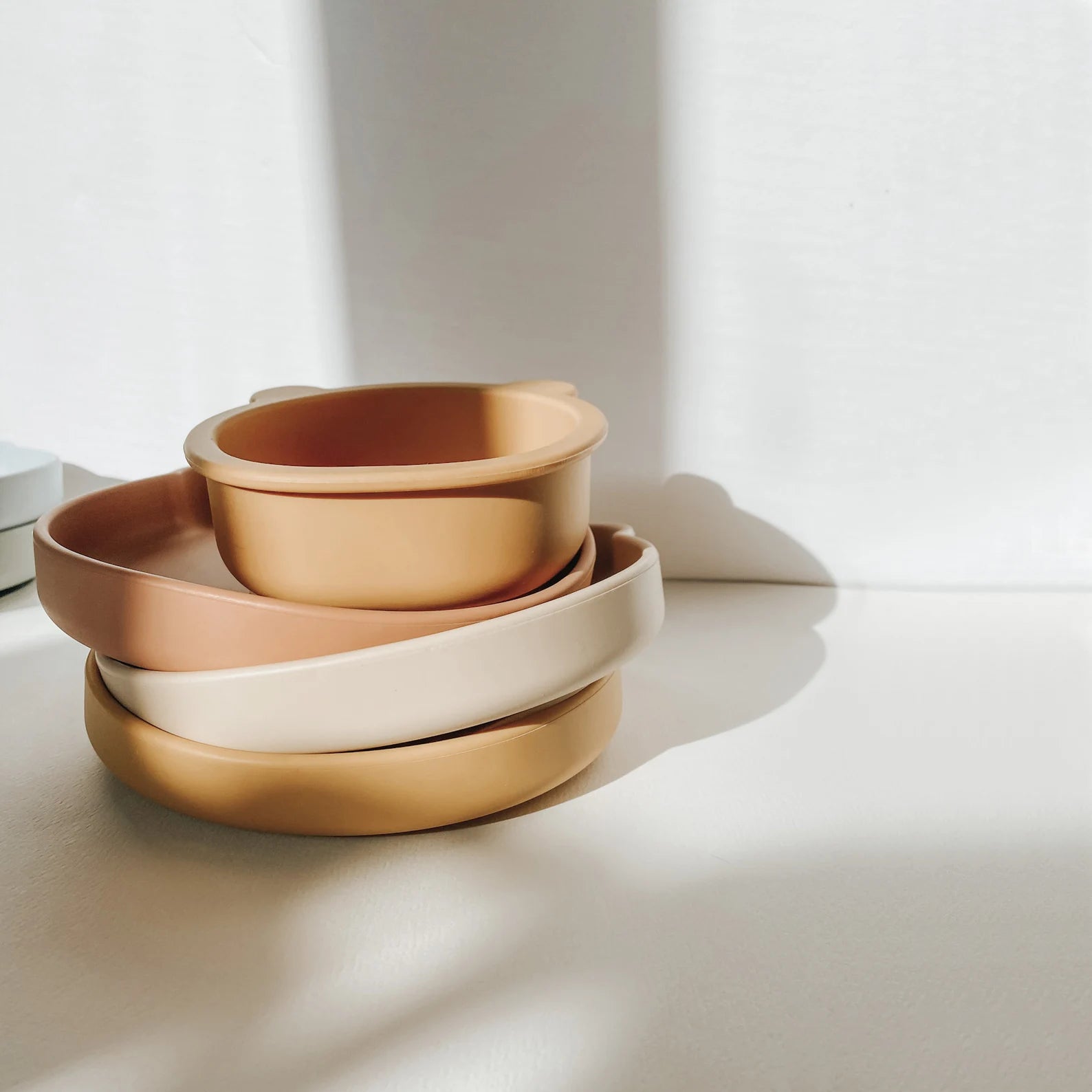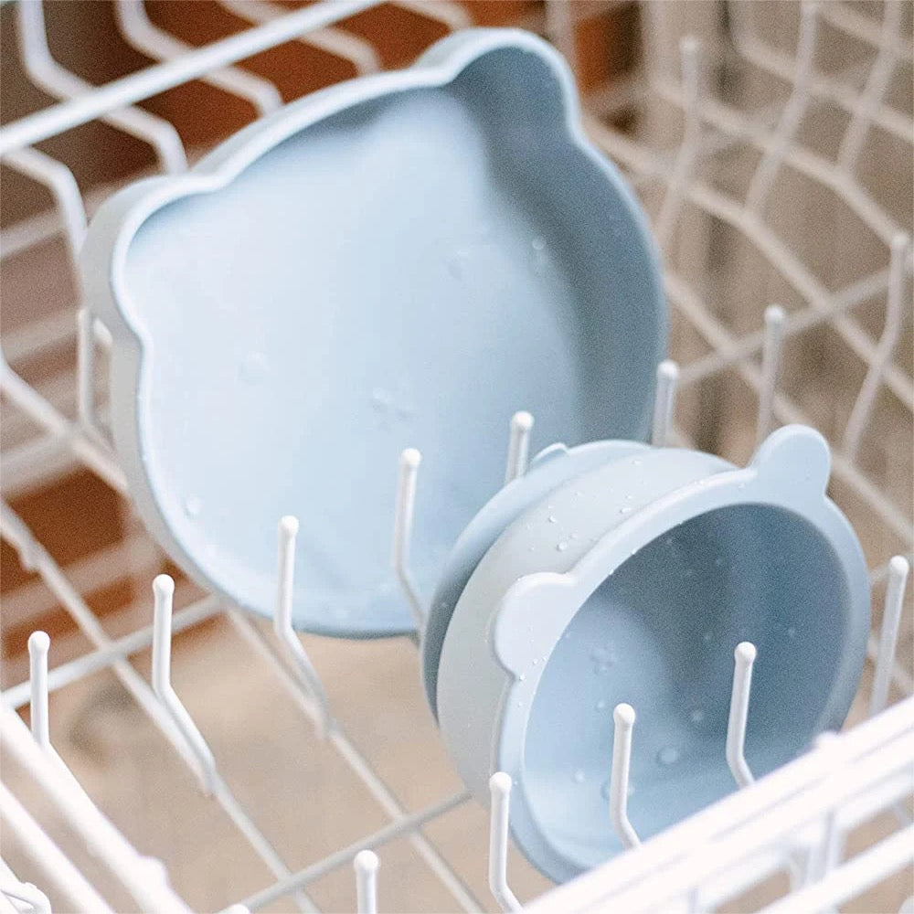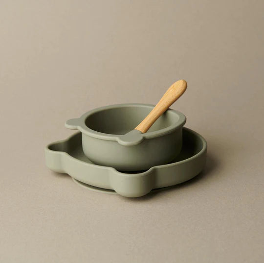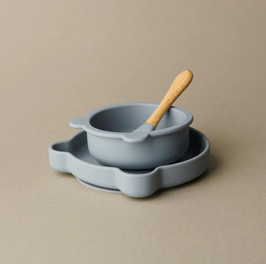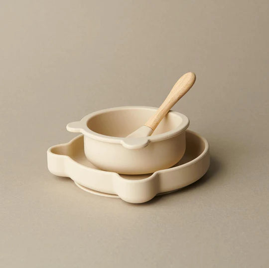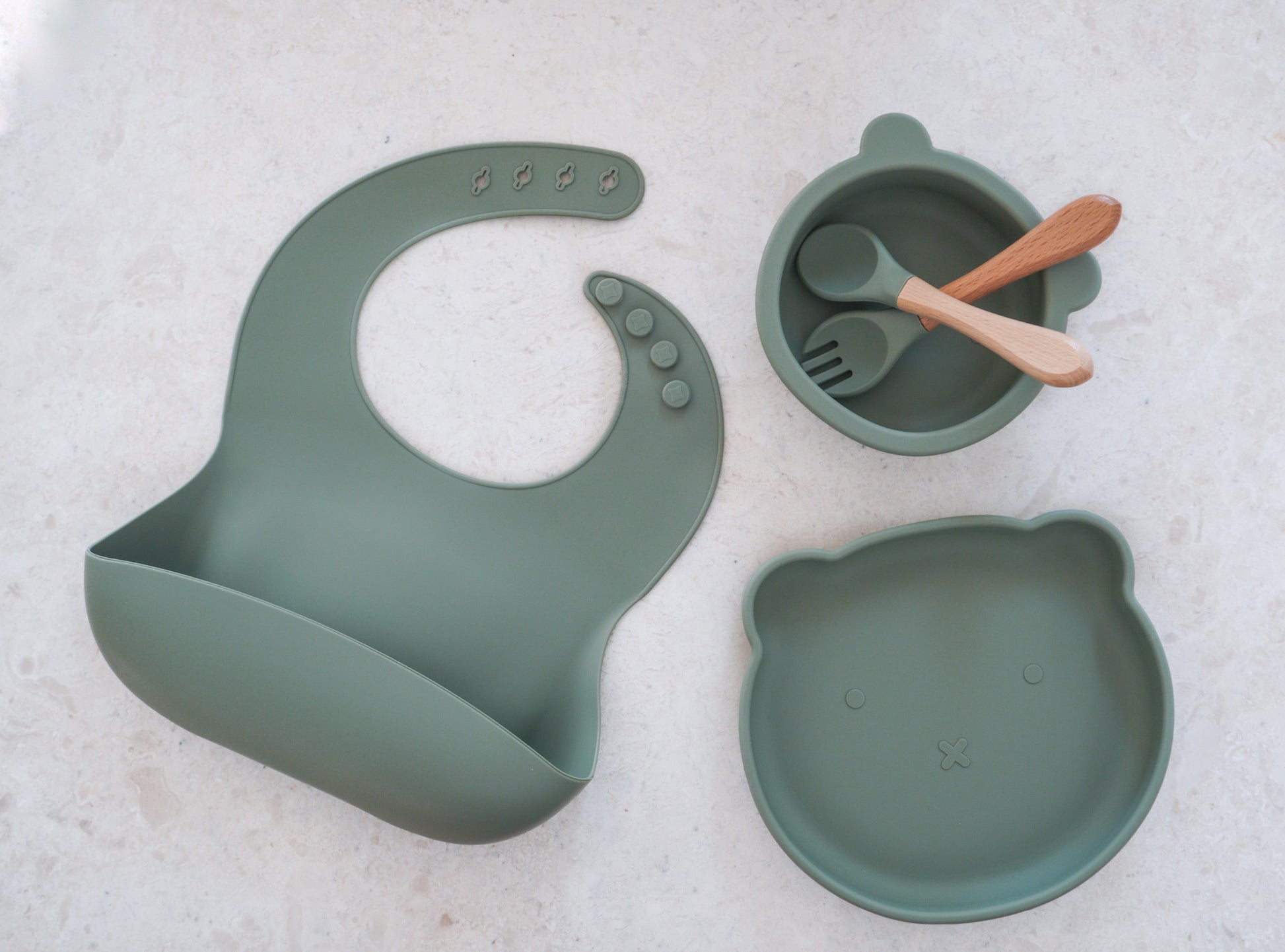 Our 5 in 1 silicone suction feeding set has got you covered with all necessary tableware products you need all in one convenient set, including bib, plate, bowl, wooden handle fork and spoon (*excluding cup*)for babies and kids, especially designed for the first meal milestone. A great non-breakable alternative to plastic and porcelain. Available in 5 cute colours bring some imagination to your table!
