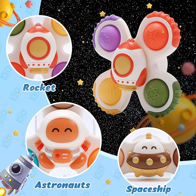- All-in-One Baby Spinner Toy Set: From suction cup toys to baby rattle toys, from bath toys to travel toys, the space spinning toy set has it all. There are flexible bearings inside, offering long-lasting rotation and bringing endless spinning fun to your baby.